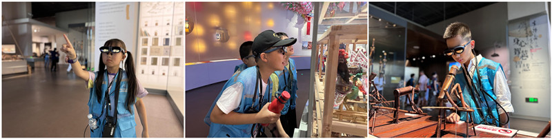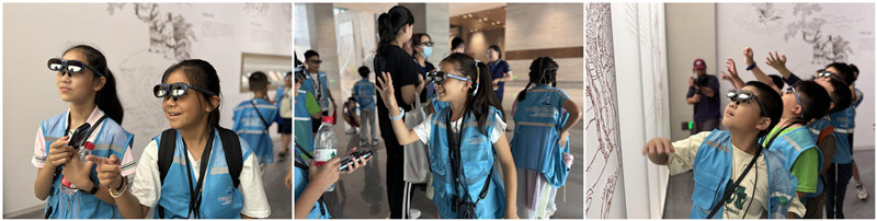 当天下午,同学们前往浙江省非遗馆,戴着由杭州本土科技公司研发制造的RokidAR 眼镜,体验AR如何把传统非遗元素通过科技手段“活”跃在眼前——24节气360度环绕周围,“绿眉毛”三桅木帆船活化重生;老手艺人在眼前指尖翻飞;戏曲演员在面前勾勒油彩……在AR眼镜的讲解下,每个展品背后的文化背景与传承故事缓缓展开,有了前期科学知识的铺垫,大家对这种新型的展陈形式更多了几分思考,也更深刻地感受科技的魅力与温度。